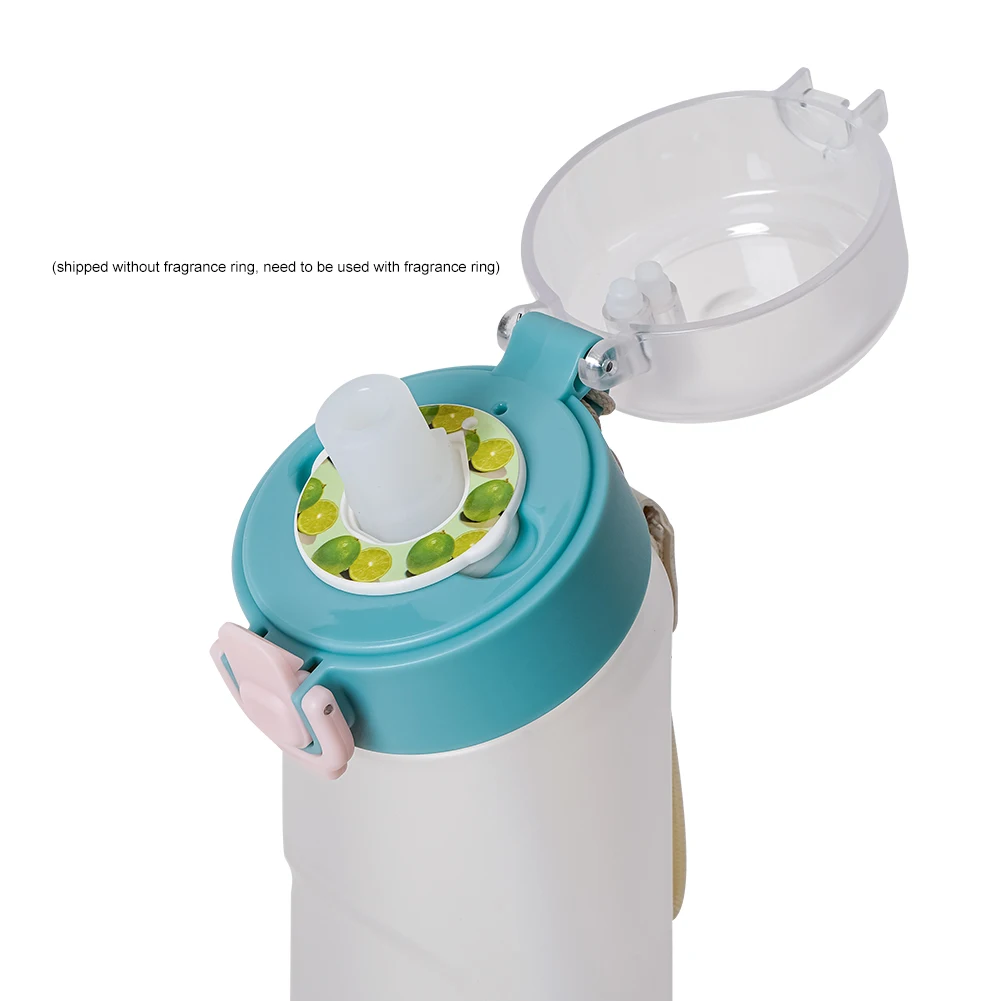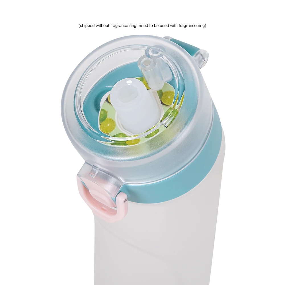 Feature: 1. Aromatherapy Function: The water bottle needs to be used with a fragrance ring, which is sold separately. The fragrance ring allows you to experience the scent of fruit even though the water itself is tasteless, making it a fun and unique way to enjoy your water. (shipped without fragrance ring) 2. Convenient Handle: The built-in handle makes it easy to carry the water bottle wherever you go, whether it’s to the gym or on a hike. 3. One-Button Press Switch: The one-button press switch allows for quick access to the water bottle, making it easy to take a sip while on the move. 4. Secure Lock Design: The lock design ensures that the water bottle won’t accidentally open in your bag, preventing spills and leaks. 5. Safe and Durable Material: Made from Tritan material, this water bottle is free from BPA and other harmful chemicals, making it safe for everyday use.